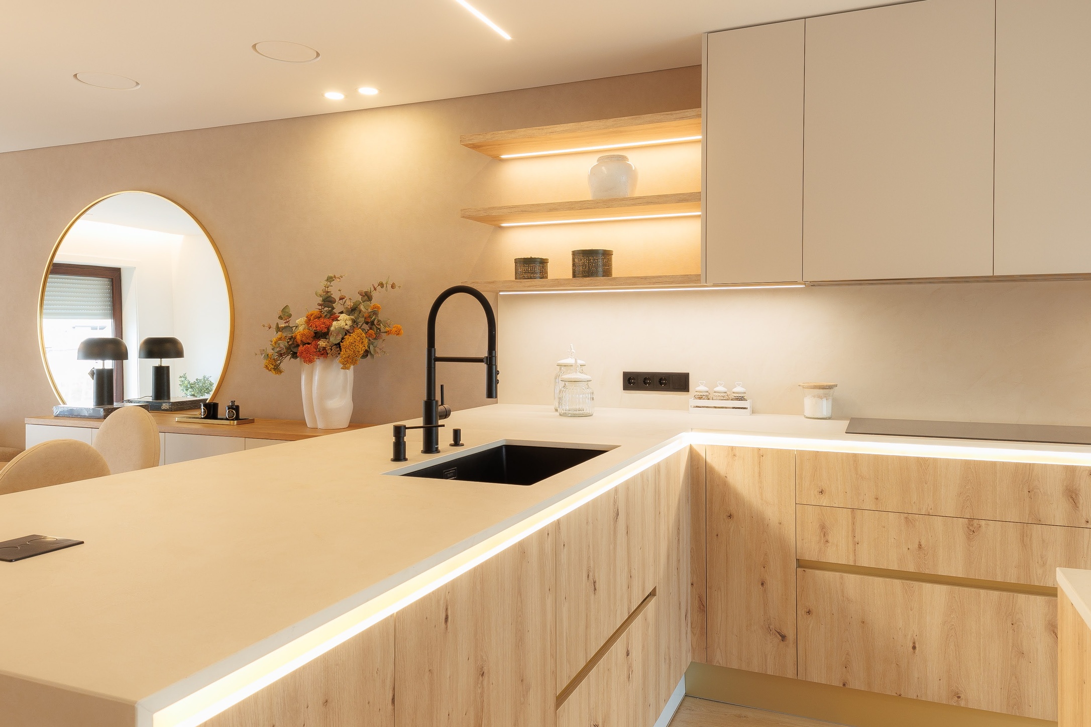 Una de las mayores fortalezas de las cocinas en L es su capacidad para adaptarse a diferentes tipos de hogar. Pueden aprovechar rincones, integrarse en espacios abiertos o incluso combinarse con una pequeña isla central. Gracias a su diseño flexible, resulta sencillo personalizarlas con distintos materiales, colores y estilos que reflejen la identidad de cada cliente.