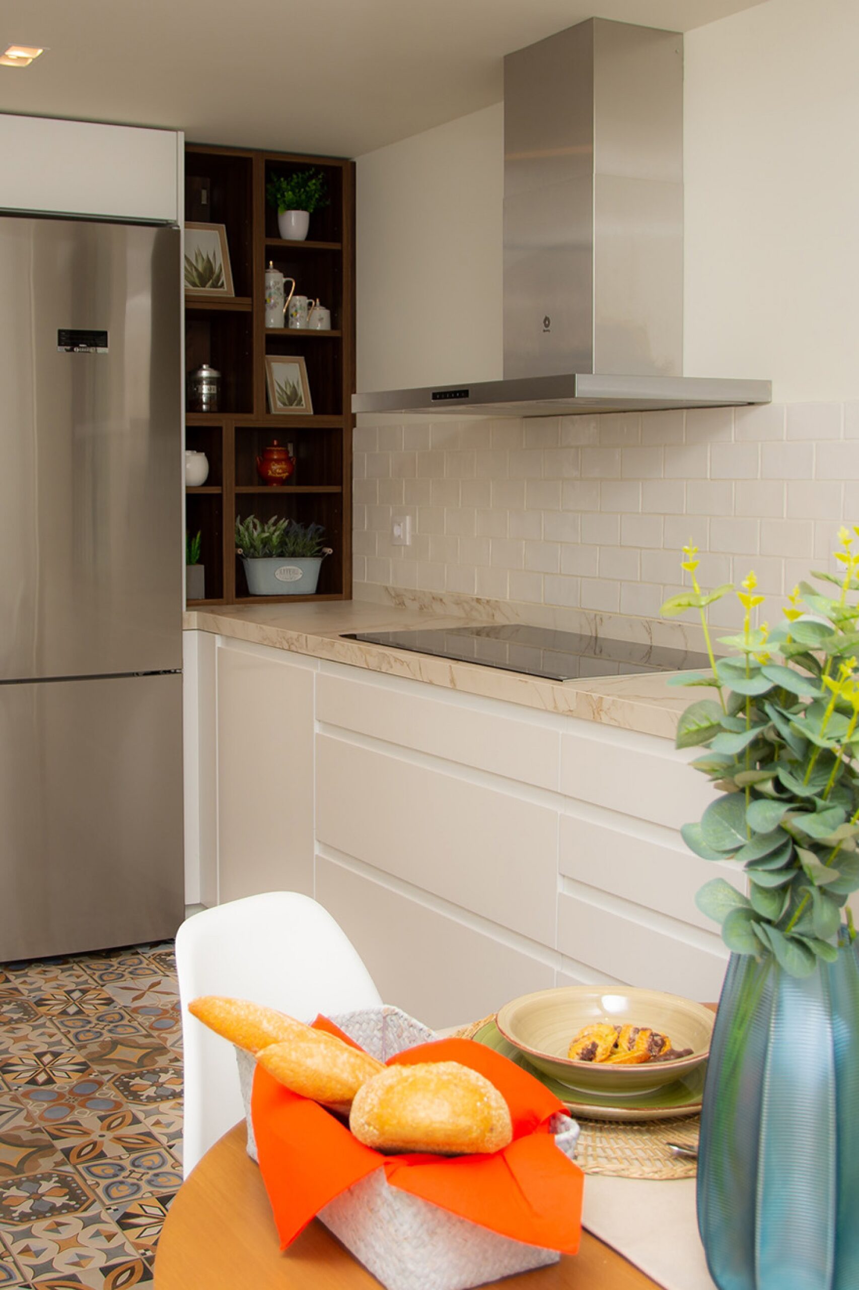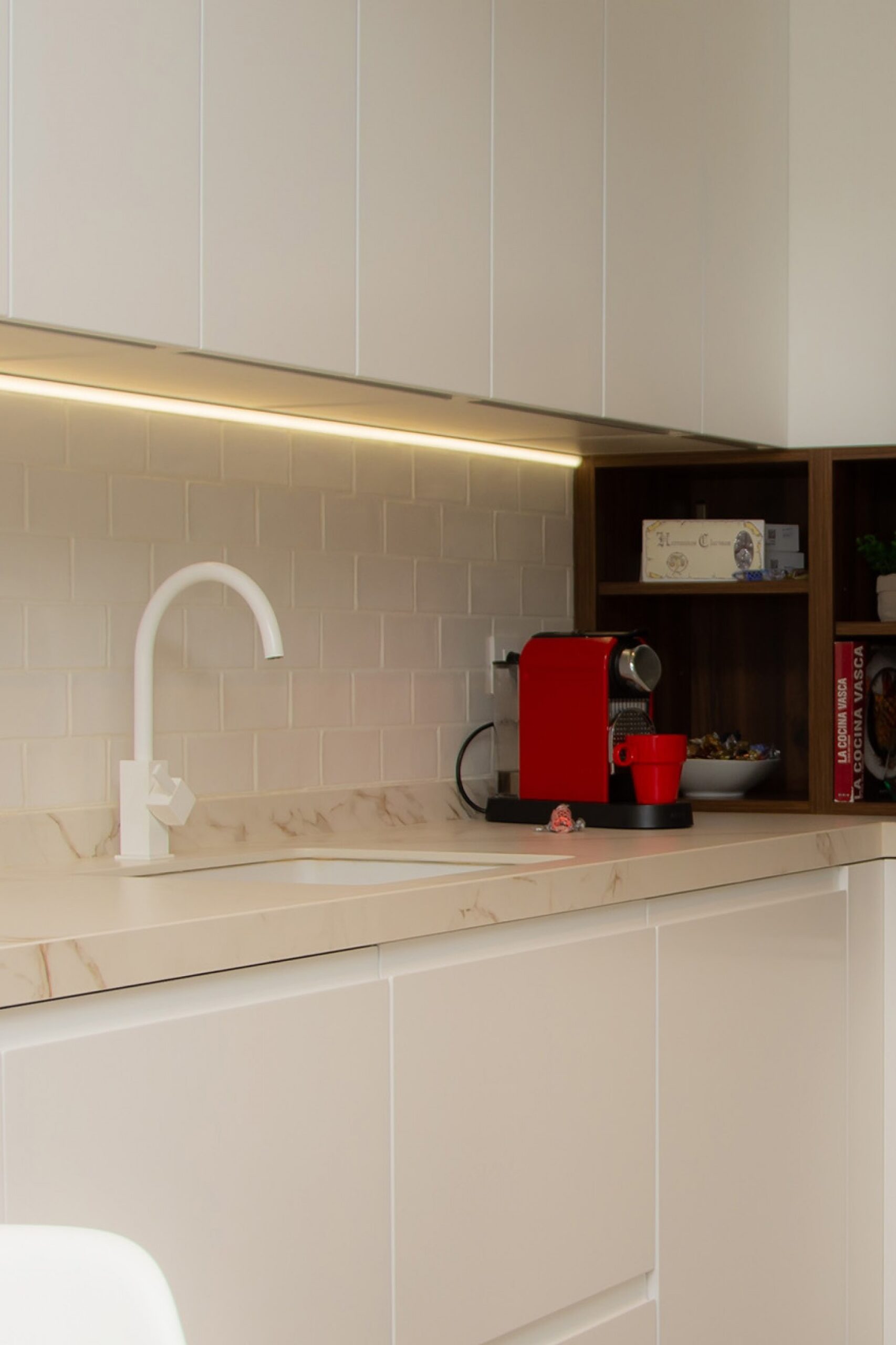 Por último, nos gustaría destacar la selección de materiales. Para los muebles bajos, Kela Interiorismo se ha decidido por nuestro modelo Calpe, lacado en blanco mate. Este modelo cuenta con la particularidad de tener tirador directo, lo que confiere un aspecto minimalista al conjunto y muy práctico. Para los muebles altos han apostado por nuestro modelo Gandía, prescindiendo también de tirador para no romper la estética. Para generar contraste, se han instalado también módulos abiertos con nuestro modelo Valentina, laminado con efecto nogal.