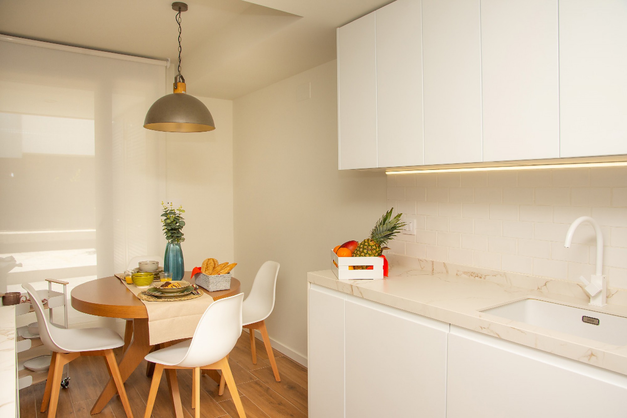 A través de ella, pasamos a una pequeña zona de comedor presidida por una mesa redonda, para llegar después a la zona de cocina, distribuida en forma de U. En sus tres paredes vemos perfectamente dibujado el triángulo de trabajo: a la derecha, la zona de cocinado, al fondo la de almacenaje y, a la izquierda, la de aguas (que cuenta también con gran capacidad de almacenaje). De esta manera, resulta muy cómodo desplazarse por la cocina.