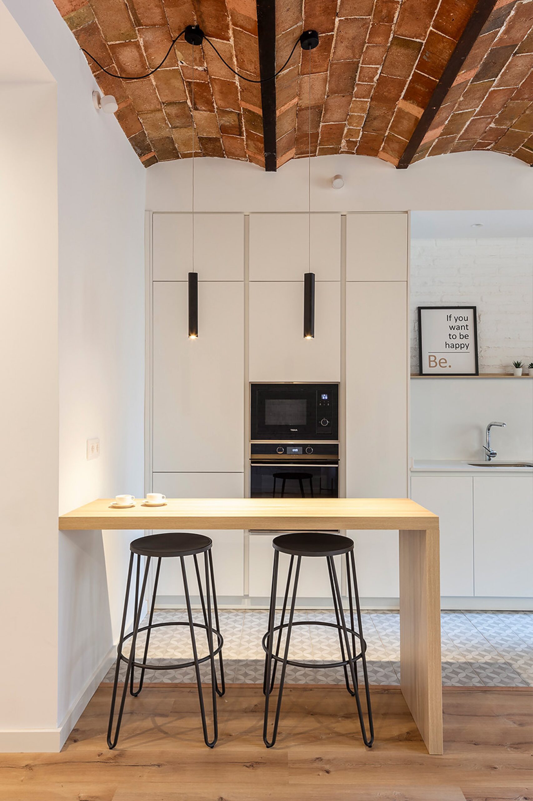 Cocina blanca con muebles minimalistas, pared de ladrillo pintado y una barra de madera con taburetes.