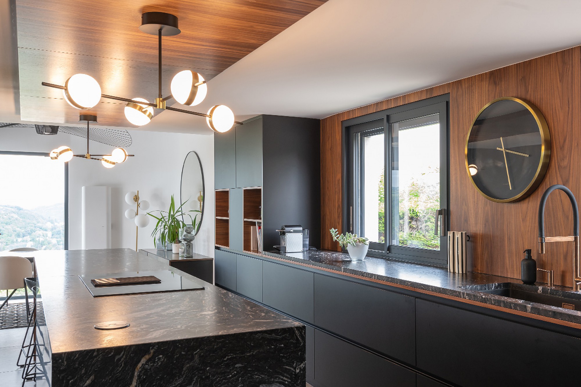 Para perfilar el aire elegante de toda la cocina, encontramos algunas pinceladas de metal dorado en la grifería, el contundente reloj de pared y en las lámparas de techo estilo Mid Century.