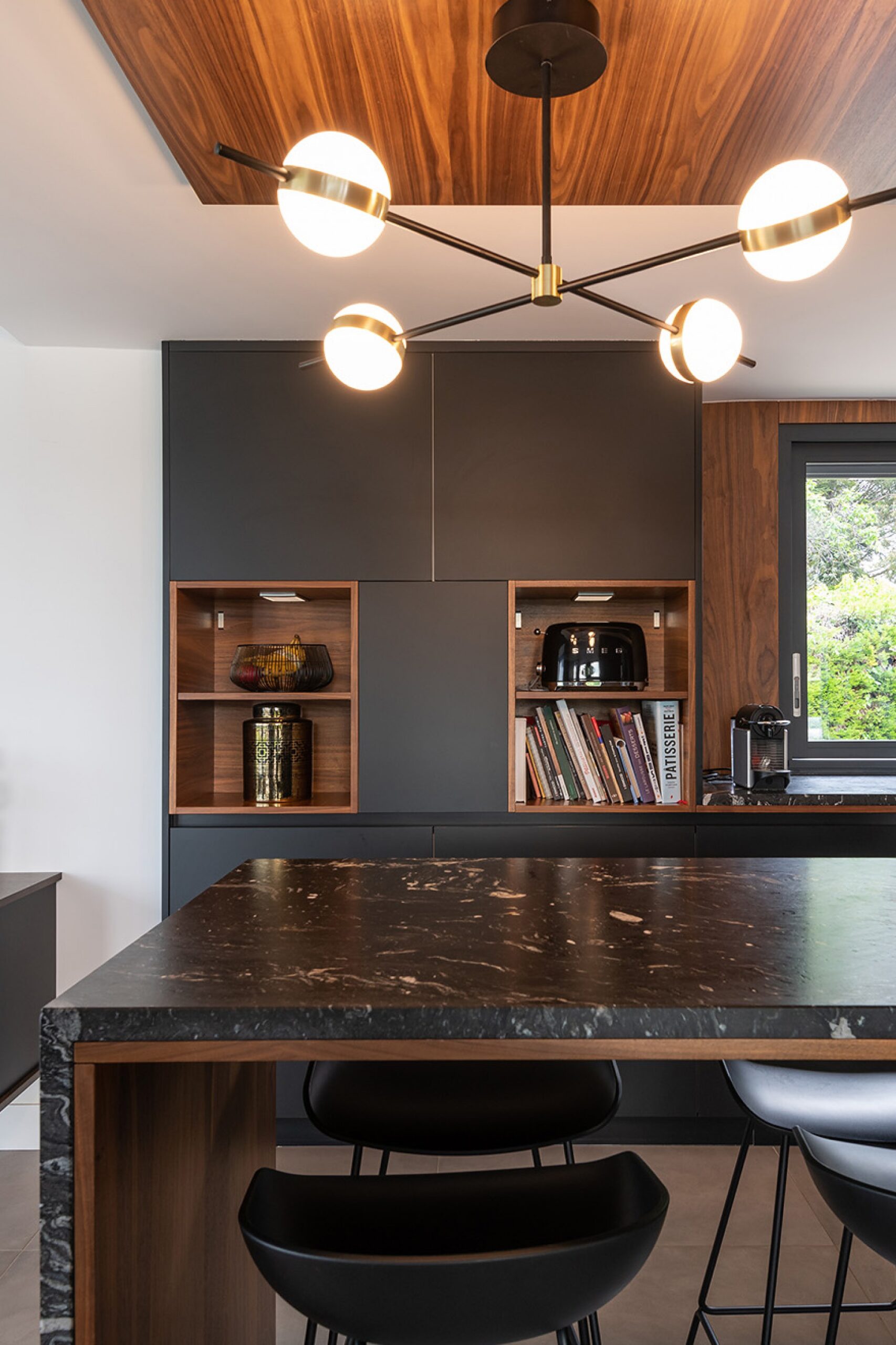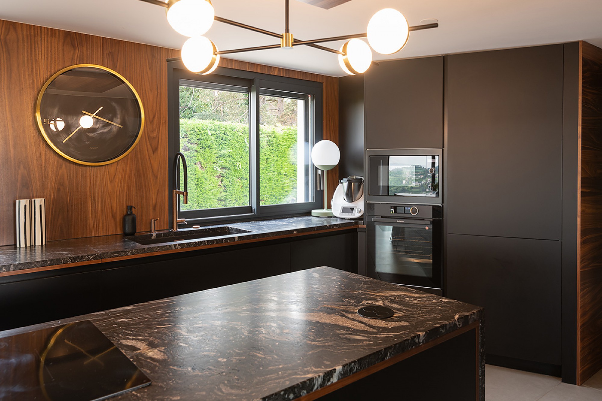 Hasta aquí, todo “normal”. Ahora bien, para los muebles vistos se ha utilizado nuestro modelo Padova, fabricado en madera de nogal. Encontramos este tipo de madera en el revestimiento de la pared de la zona de trabajo y en el techo, sobre la isla. Es esta combinación de materiales la que empieza a crear la magia en la cocina. Sin embargo, debemos decir que el toque maestro y que pone en valor todo el conjunto, es la espectacular encimera que corona todas las superficies (especial mención al efecto que crea en la isla central). Está realizada en granito Cheyenne, un material de profundo color negro sobre el que las vetas blancas y grises crean formas sugerentes y elegantes.