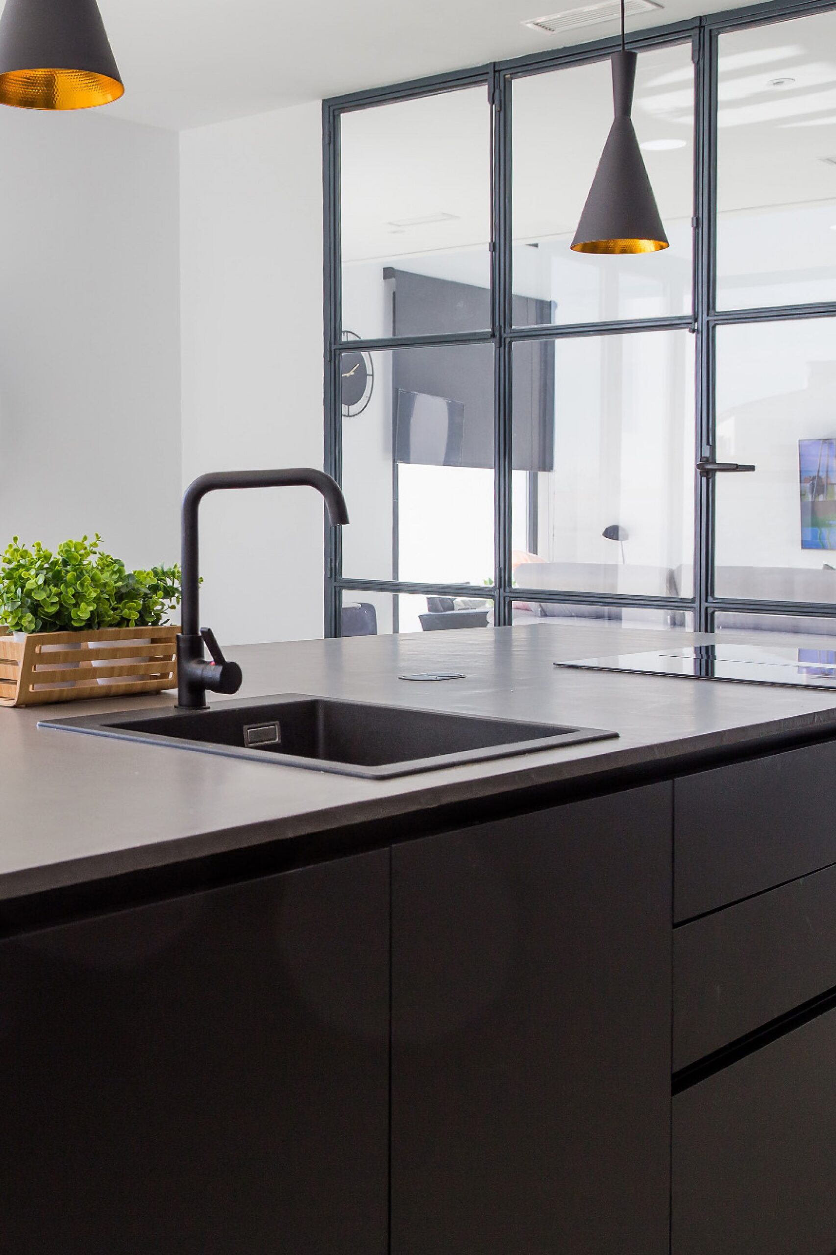 Del mismo modo, todos los electrodomésticos que se han integrado en el mobiliario (frigorífico, vitrocerámica, horno y microondas…), así como el fregadero y el grifo, son de color negro. ¡Hasta las piezas decorativas y los pequeños electrodomésticos son negros!