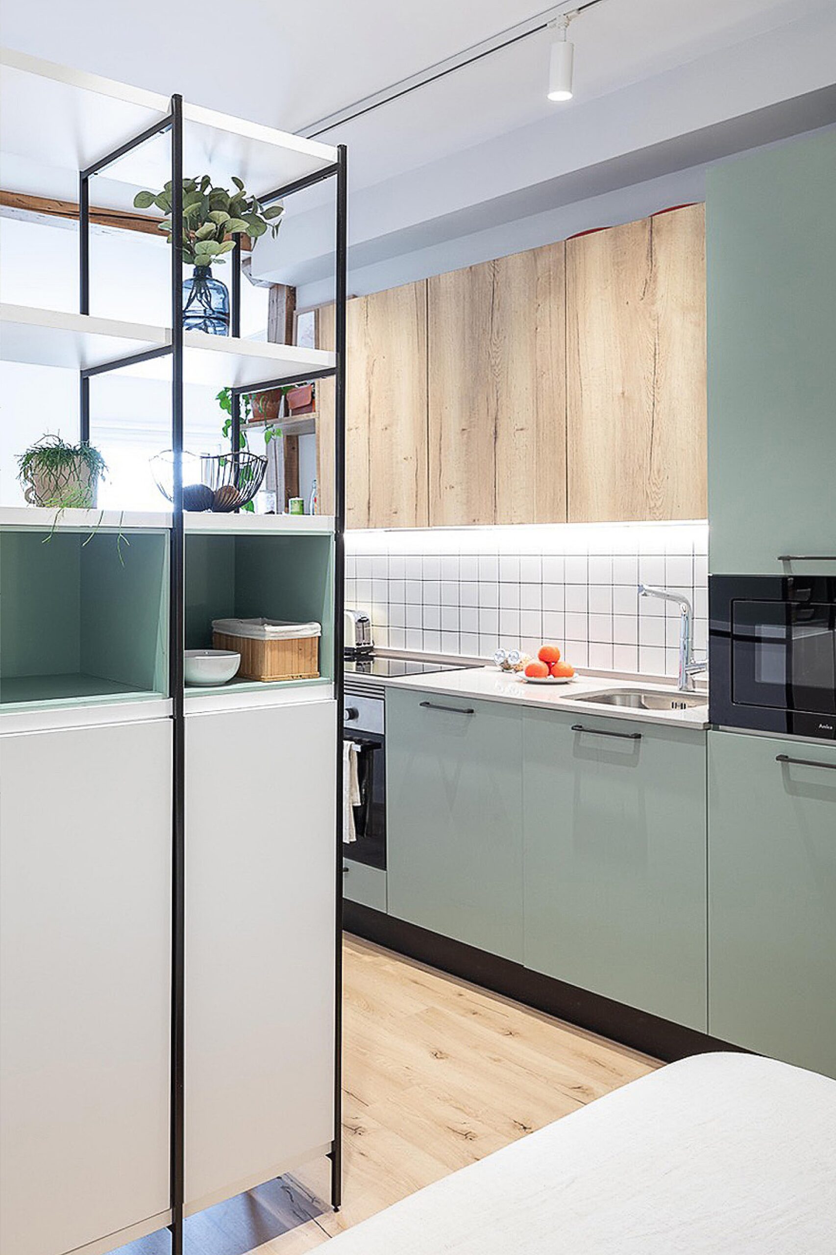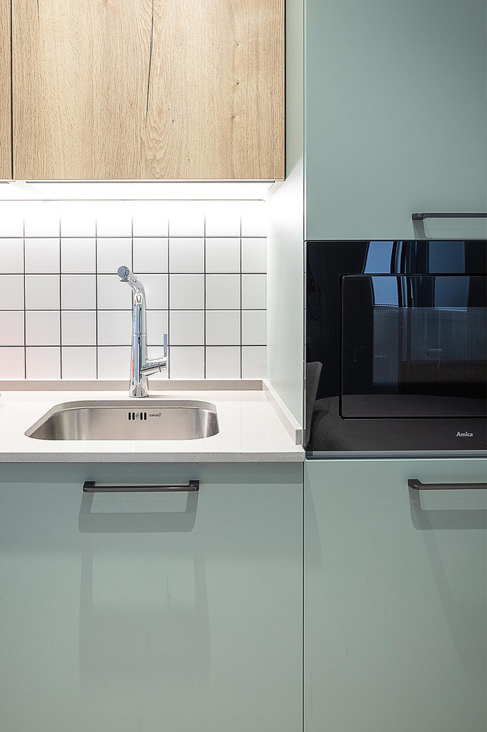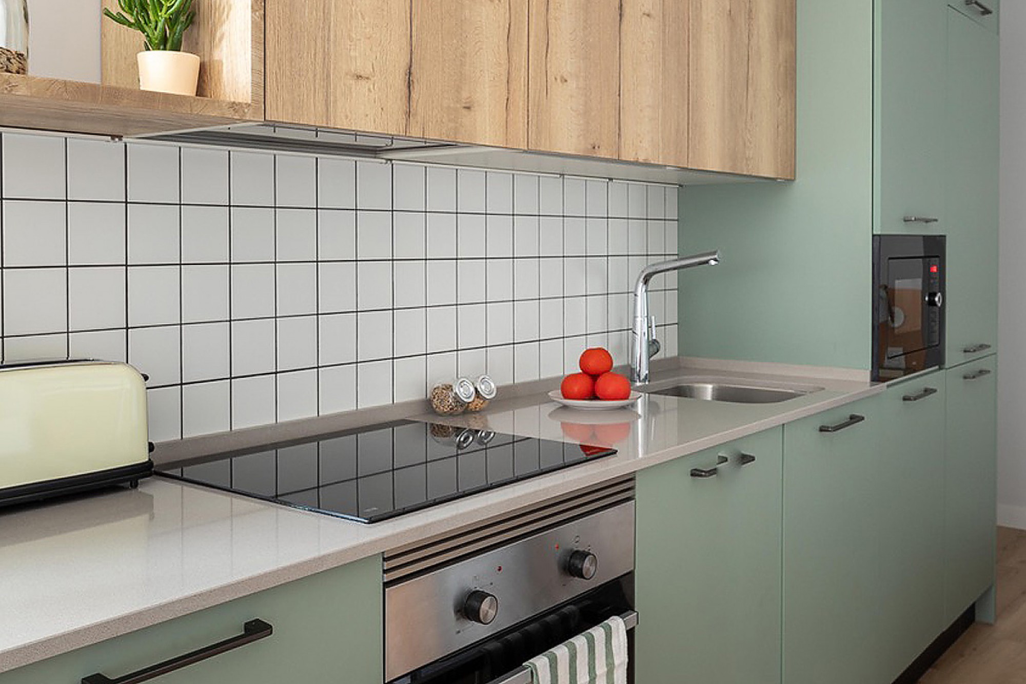 Para dar un aire urbano, se ha revestido pared con un papel vinílico que imita los clásicos azulejos blancos cuadrados, solo que con una vuelta de tuerca al marcar las juntas en color negro. La parte superior se ha destinado casi en su totalidad al almacenamiento, aunque en uno de los muebles altos encontramos, encastrada, la campana. Con el reto de la distribución superado, pasemos a fijarnos en la estética, que también tiene mucho que decir. Y es que en un apartamento de dimensiones tan reducidas era esencial no añadir peso ni ruido visual. Todo, sin renunciar a la alegría del color. Para conseguirlo, Muebles Basoko Altzariak se ha decantado por la frescura de nuestro modelo Vitoria en color verde para muebles bajos y columnas. Tanto el frigorífico como el lavavajillas han sido panelados para integrarse en el esquema de diseño.
