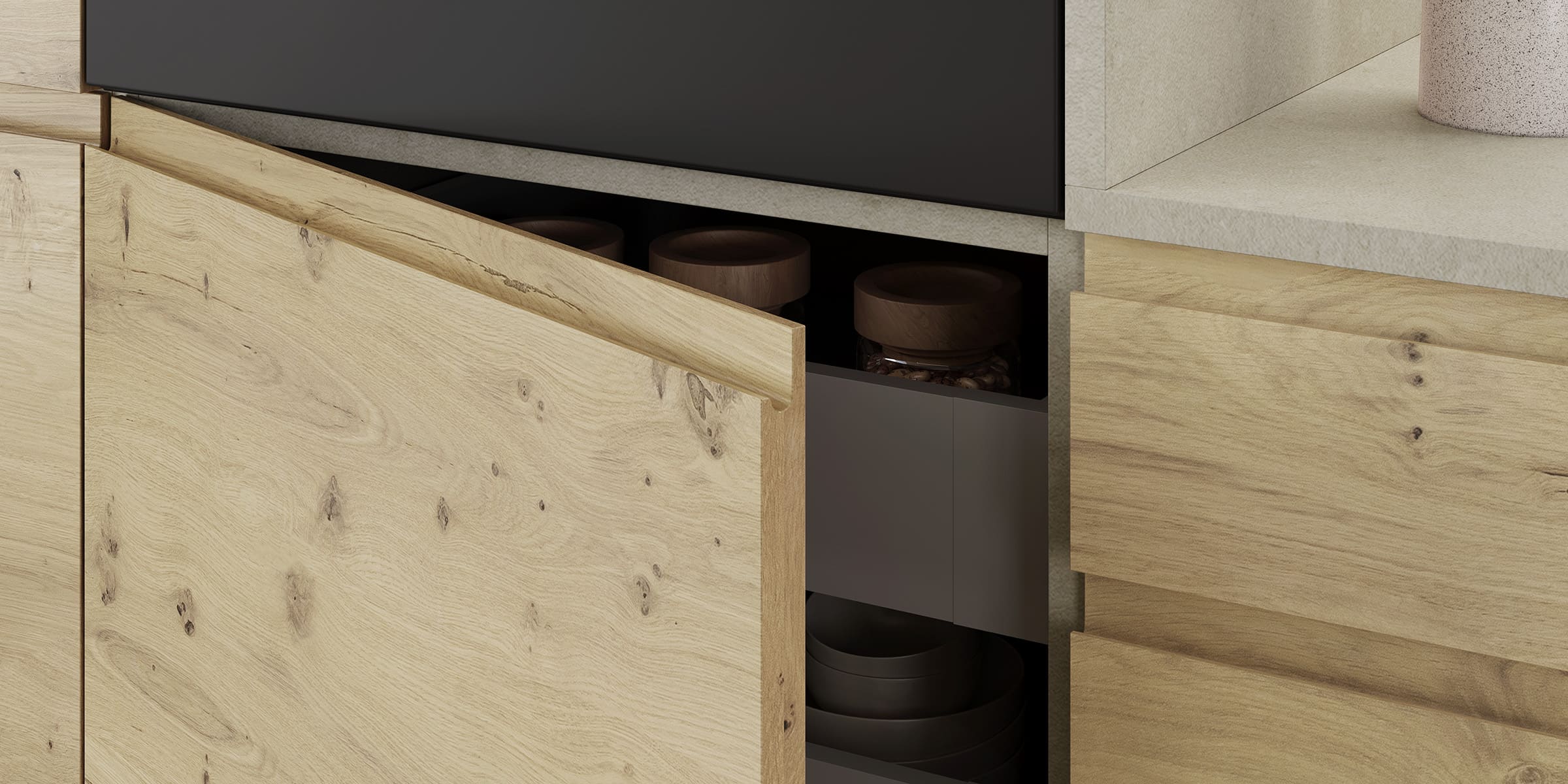 El perfil J de la puerta, se integra con discreción en las superficies, permitiendo que la madera sea la verdadera protagonista. Su diseño sutil evita interrupciones visuales, dando lugar a un conjunto equilibrado donde cada línea fluye con naturalidad. El resultado es una estética limpia y contemporánea que respira coherencia.