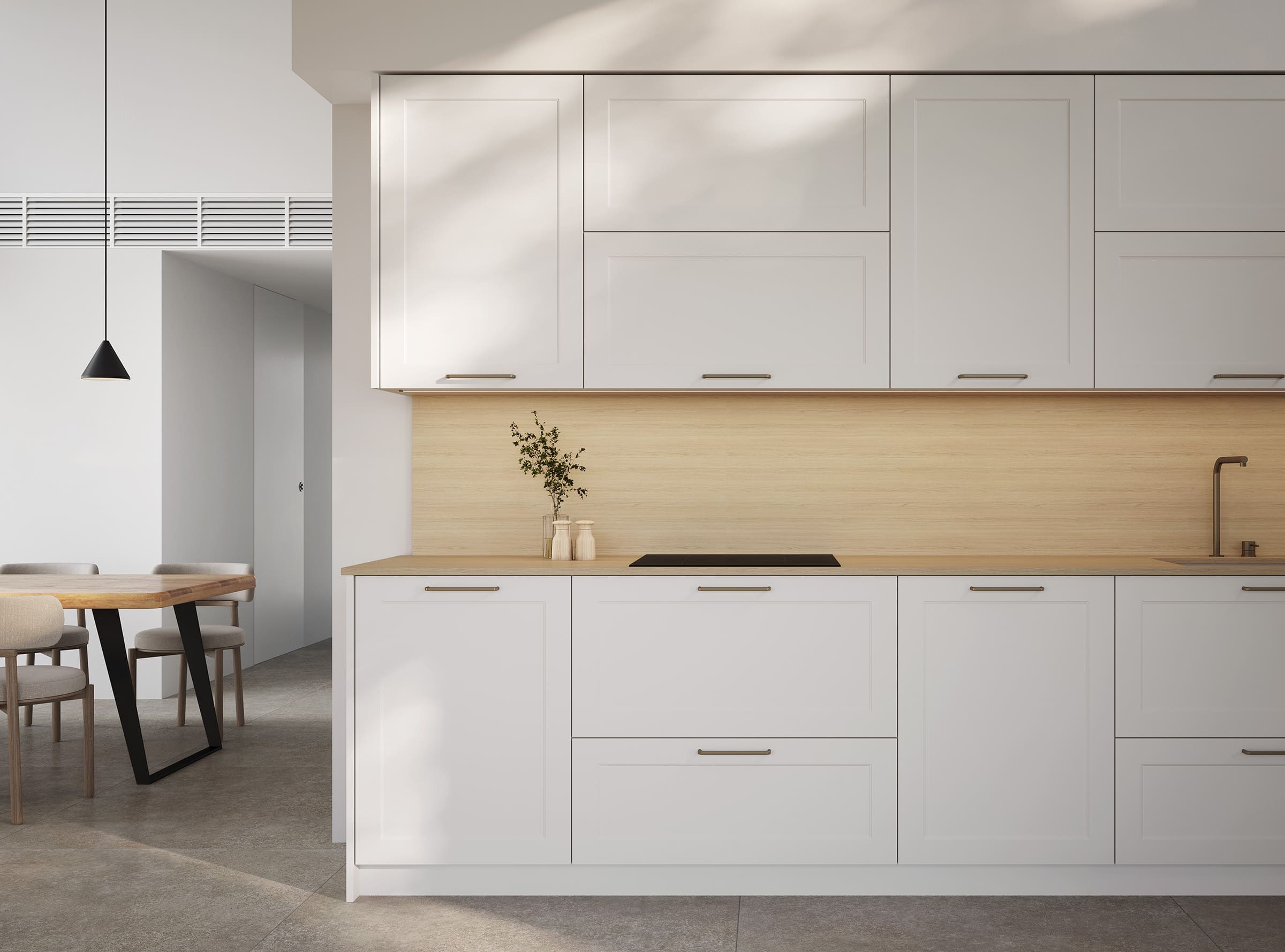 En esta cocina en L, la geometría y la luz se combinan para crear un espacio de líneas puras y equilibrio visual. El blanco, protagonista absoluto, envuelve la estancia con una elegancia serena que amplifica la sensación de amplitud. Cada plano y cada volumen se ordenan con precisión, dando lugar a una propuesta minimalista que respira calma y claridad.